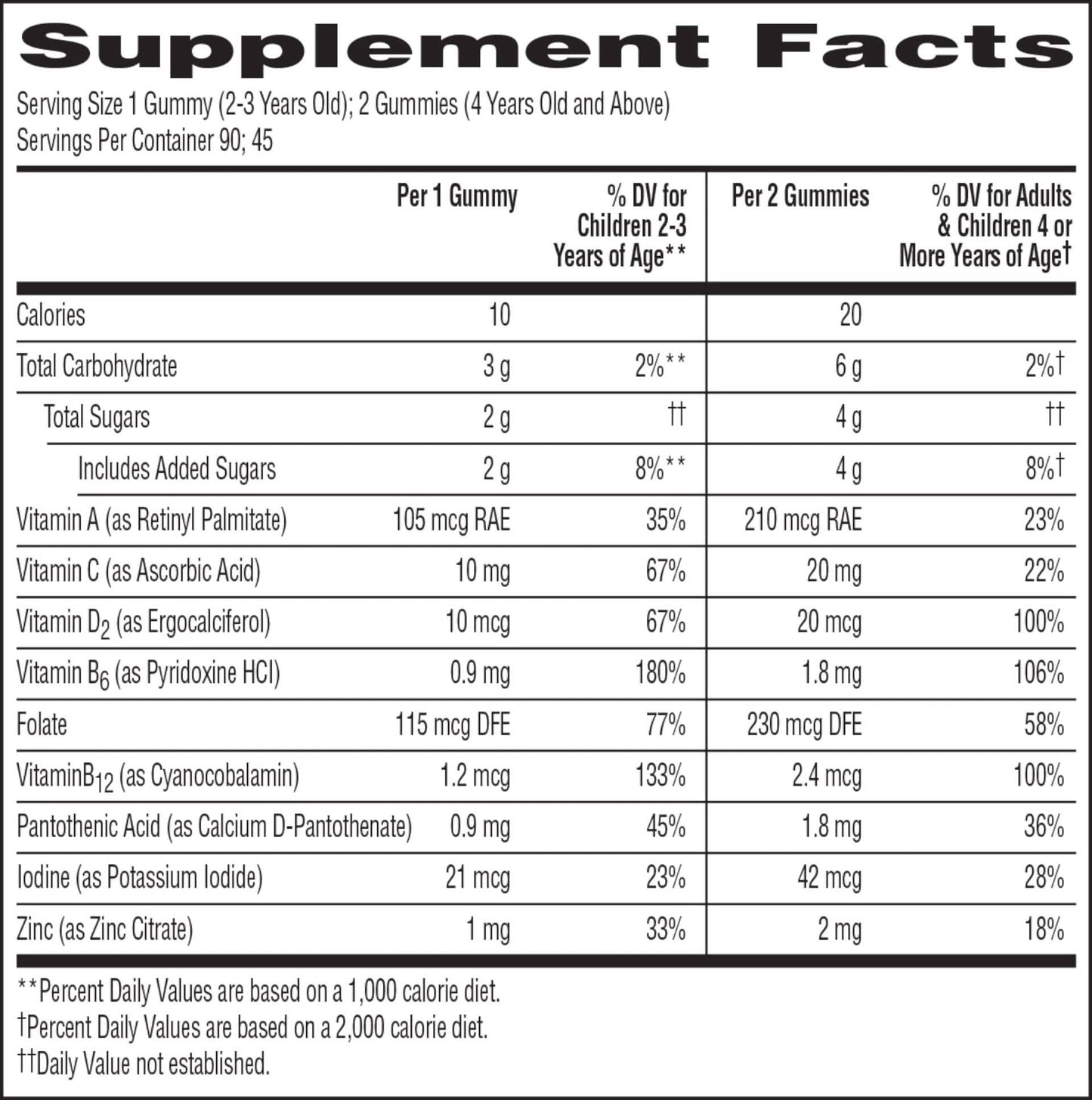 Vitamins A, C, D2, B6, B12, folate, pantothenic acid, iodine, zinc pantothenic acid, iodine and zinc, tapioca syrup, cane sugar, water, pectin, citric acid, natural flavors, natural colors, sodium citrate, sunflower oil, carnauba wax.