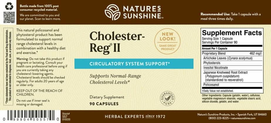 Each capsule of Cholester-Reg II provides a 500 mg blend of policosanol, plant sterols, inositol nicotinate, resveratrol and artichoke powder.