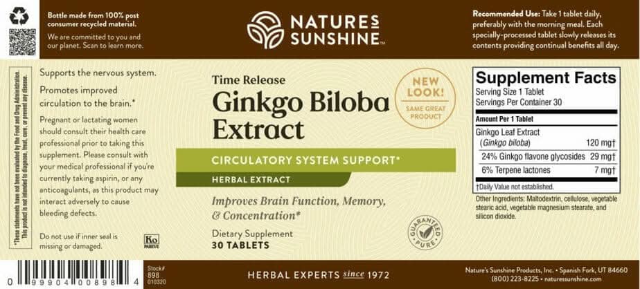 tablets supply a 12-hour timed release formula to provide the benefits of ginkgo biloba throughout the day. Each tablet contains 120 mg. of concentrated Ginkgo biloba extract standardized to 24% ginkgo flavone glycosides and 6% terpene lactones.