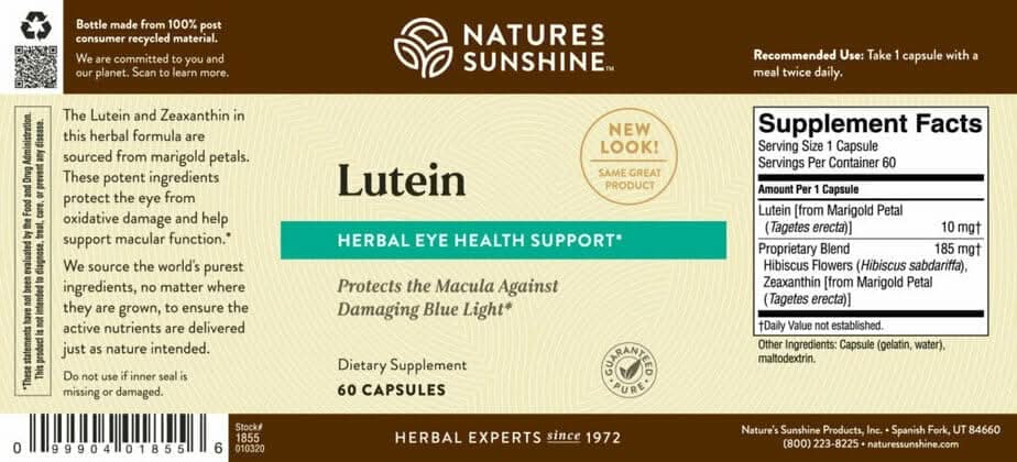 Each capsule of Nature's Sunshine's Lutein provides 10 mg Lutein, plus proprietary blend of Zeaxanthin and Hibiscus flowers (Hibiscus sabdariffa).