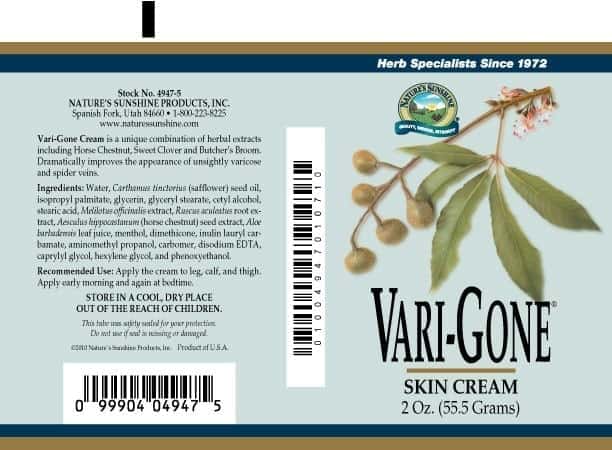 The extracts contained in Vari-Gone Cream are provided in a base of natural skin cosmetic ingredients to promote improved appearance of unsightly varicose veins. Vari-Gone Cream may also be used to improve the general appearance of skin and to minimize the unsightliness of spider veins.